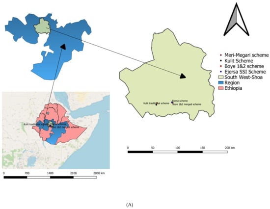 This study was conducted in the south-west Shoa zone of Oromia, Waliso, and Ameya districts, which are located between 110–158 km from the capital city of Ethiopia, Addis Ababa, along the main road to Jimma. Four small-scale irrigation schemes were purposively selected (Figure 1) based on three sets of criteria. Firstly, all schemes had to meet the criteria of proximity and accessibility. Secondly, a variety in the degree of sedimentation varying from light to heavy sediment loads was required, whereby the Boye 1 and 2 merged scheme represents the lightly sedimented category and the Ejersa small-scale irrigation scheme represents the heavily sedimented category. Thirdly, this study probed what happens when a scheme is abandoned due to sedimentation, including both an abandoned scheme (Meri-Megari) and a new scheme that was started in response to abandonment (Kulit) in the same location. Hence, four schemes were selected, of which three are functional schemes and one is a non-functional scheme.