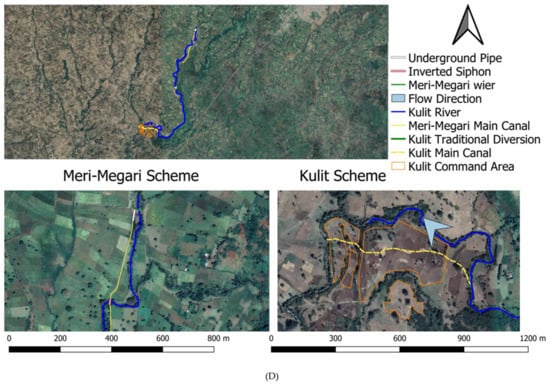 (A) Location of the study area with the four case study irrigation schemes. (B) Ejersa small-scale irrigation scheme. (C) Boye 1 and 2 merged small-scale irrigation schemes. (D) Meri-Megari scheme and Kulit traditional small-scale irrigation scheme. (Source: Hanan Tadele, own material.)