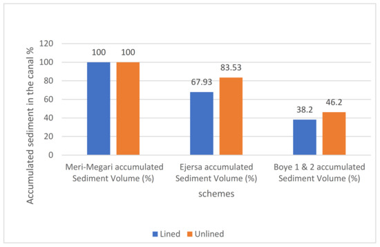 The Ejersa scheme comes in the second position regarding its vulnerability to sedimentation. It suffers from a heavy sediment load. However, the Ejersa scheme users are well organized, with a strong water user committee capable of keeping the scheme functional. While the scheme is irrigating its full command area, the amount of labor that is required to clean the canals each season is considerable. About 68% of the lined canals and 84% of the unlined canals were found filled with sedimentation in 2019 before the start of the irrigation season (Figure 2). The farmers removed the accumulated sediment before the beginning of the irrigation season in September. Moreover, the farmers clean the scheme every month to keep it operating at full potential. The accumulated sediment load in the canal network was observed to be heavier at the furthest point from the intake, showing a tendency for suspended sediments to settle as current flow velocity dwindles.