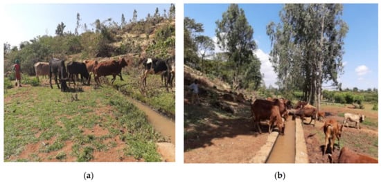 (a) Cattle grazing and crossing the canal. (b) Cattle drinking from the canal. (Source: Ejersa scheme pictures by Hanan Tadele, 2019.)
