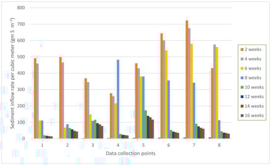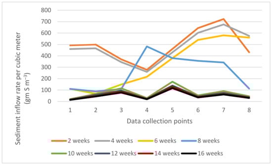 The sediment inflow to the Ejersa irrigation scheme was measured weekly at eight points along the 1.85 km of lined main intake canal. The sediment inflow level varies from one data collection point to another. Figure 5 shows a variation in sediment concentration across the data collection stations; the maximum and minimum sediment concentrations were found in different stations due to livestock disturbances. The minimum sediment inflow per cubic meter per second was observed in the fourth station for the first 4 weeks followed by station two from week four to week eight, and from week 8–16, the minimum sediment inflow was observed at the first station or the intake.