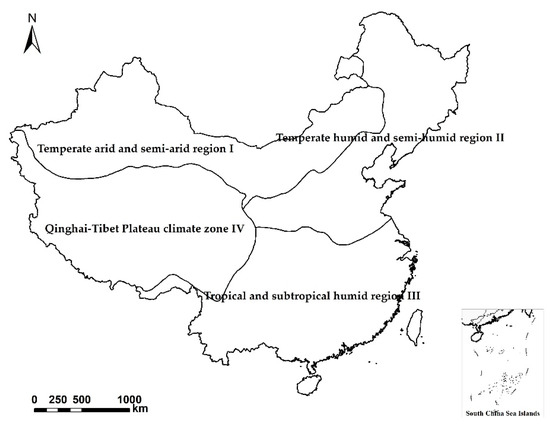 China has a vast territory and spans multiple temperature zones. The dry and wet conditions in different regions also differ. Therefore, in the analysis of the results, the climate zoning information, with comprehensive consideration of temperature and moisture, was used to determine the hydrothermal background of the climate to supplement the description of the location (Figure 2) [26].