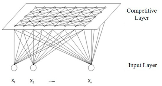 The topology structure of the SOFM network is a fully interconnected neuron array composed of two layers: the input layer and the competitive layer (Figure 3). The input layer is used to receive input samples, and the input samples are classified in the competitive layer. The specific learning process of the SOFM primarily involves the initialization and training of the network. The training process of the network involves adjusting the weights of the neurons in the competitive layer. The arrangement of neurons in the competitive layer is specified by the topological function, and the distance between neurons is calculated by the distance function.