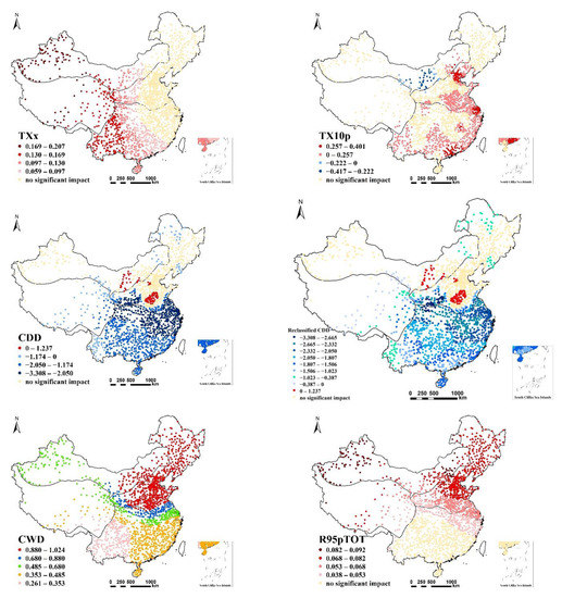 The spatial pattern of the regression coefficients of each extreme climate variable is shown in Figure 4. As regards the impacts of TXx on vegetation, the sites in Northeast China, North China, the middle and lower reaches of the Yangtze River, and the southeast coastal areas did not pass the significance test. In the sites that passed the significance test, the TXx was positively correlated with vegetation growth, and the degree of influence gradually increased from east to west. The spatial scale of the effects was large (regional). The direction of influence was the same at all the stations that passed the significance test, but the degrees of impact varied between regions.