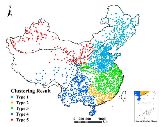 The spatial pattern of the clustering results affecting NDVI is shown in Figure 5. The spatial agglomeration characteristics of the five types are obvious. Type 1 is mainly distributed in the Northeast Plain and the North China Plain, in the temperate humid and semi-humid regions, and in the eastern parts of the temperate arid and semi-arid regions. Type 2 is distributed in the southern part of the tropical and subtropical humid areas of Guangdong Province, and on the boundaries of Guangdong and Fujian, Hunan and Guangxi, and Hunan and Guizhou. Type 3 is mainly concentrated in the north and east of the tropical and subtropical humid regions, such as the middle and lower reaches of the Yangtze River plain and the surrounding area. Type 4 is located in the Qinghai–Tibet Plateau and the transitional zone between the region and tropical and subtropical humid areas, including the southeastern part of the Qinghai–Tibet Plateau, the Sichuan Basin, the Yunnan–Guizhou Plateau, most of Guangxi, the Leizhou Peninsula, and Hainan Island. Type 5 is mainly located in the central and western areas of the temperate arid and semi-arid regions, the northeastern part of the Qinghai–Tibet Plateau, and most of the Loess Plateau.
