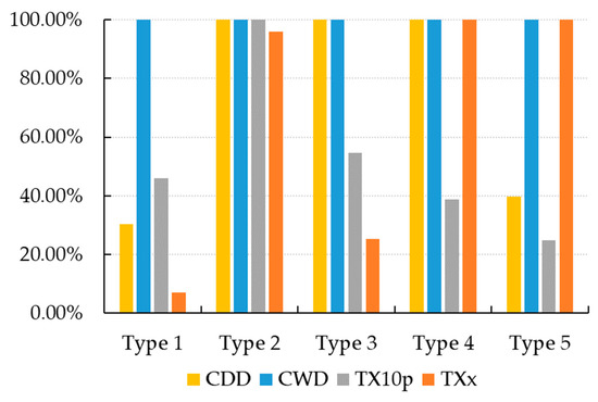 On the basis of the above classification test, the difference between the mean value of the regression coefficients of different extreme climate indices in each type and the national mean value was calculated to judge the magnitude of the impact. The results are shown in Figure 6. For the convenience of comparison, the difference in CDD was calculated after taking the absolute value of the regression coefficient into account. Through the size of the value of difference, we can judge the “intensity” of the impact of the extreme climate index on vegetation. Based on the results of the analysis of regression coefficients, the regression coefficients of some sites did not pass the significance test (their influence was not significant). Therefore, the significance test should be taken into consideration when identifying specific features of each type. We calculated the percentage of sites that passed the significance test for the different extreme climate indices in each type. The results are shown in Figure 7. According to the proportion, the impact scope of each extreme climate index on vegetation in different types can be identified. At the same time, the proportion can be used to examine the results of impact intensity. The elements with a higher proportion of sites passing the significance test and greater influence intensity are the dominant ones.