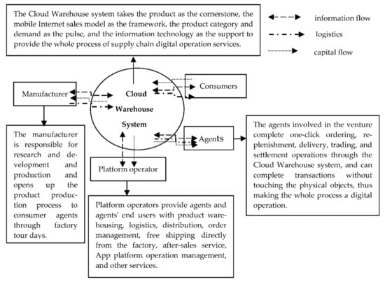 In the case study, the Cloud Warehouse system is the visible carrier of IT enablement (Figure 3). The enterprise, in this case, was able to have a close connection between the technology platform and customer needs by building the Cloud Warehouse system. Through the visibility, convenience, association, and persistence of the Cloud Warehouse system, a flat digital operation platform based on maternal and infant products, supported by information technology, and precise alignment of needs was realized. The flat supply chain and full-process digital operation have also been realized through this platform. In the traditional supply chain, logistics covers the whole chain of the supply chain, with the manufacturer shipping the finished products to the downstream distributors or agents, who then ship them to the final consumers. Agents need to manage their own inventory and handle the logistics business from ordering, replenishment, and shipping and paying the corresponding costs. In the supply chain with the Cloud Warehouse system as the core, IT enablement liberates the agents. The logistics only occurs at the beginning and end of the supply chain. The other intermediate links are digital virtual flow, which means that the manufacturer deposits the finished products in the factory warehouse (here, the logistics flow is internal or short-haul flow). After the agents place orders through the Cloud Warehouse system, the platform operator coordinates with the factory to ship directly to the final consumers free of charge according to the order data. Here, the final stage is where the actual physical flow occurs. The overall efficiency was dramatically improved, and the problem of handling inventory and delivery of particular groups of agents was effectively solved.