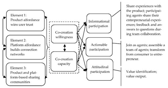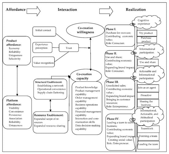 This study combined the case study approach and applied the SPS case study logic. Through case data collection, interviews and practical observations, the study found the following: (1) Four characteristics of a product (product economics, reliability, uniqueness, and selectively) trigger the original willingness of customer value co-creation. (2) Four attributes of the platform enhance users’ abilities to participate in value co-creation: visibility, convenience, association, and persistence. (3) The interaction of structural enablement and resource enablement based on product affordance and platform affordance drives value co-creation. (4) According to the classification of users’ participation behaviors, the evolution of user participation in value co-creation has four stages: the pre-participation stage, informational participation stage, actionable and informational participation stage, and full participation stage (information, actionable, and attitudinal participation).