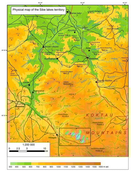 The broader study area is located close to the geographic centre of Asia delimited by the eastern flanks of the Altai-Alatau orographic system forming the natural boundary of Kazakhstan and China (Xing-Jang Province) (Figure 1A). The group of Sibe lakes is found at foots of the Koktau Mountains of the Kalba Range which is an isolated orographic unit of the Kazakhstan Altai []. The montane relief represents a continuation of the western low-orogenic massifs on the left bank of the Irtysh. The eastern half of the Kalba Range is characterized by the E–W-oriented low-mountain topography, with the prevailing elevations 700–1300 m asl. and single peaks reaching 1400–1600 m asl. Their regional geological formations relate to the Upper Palaeozoic (Varissian) Earth crust folding succeeding the most intense Lower Palaeozoic (Caledonian) regional orographic development with granite intrusions. Extensive formations of shales, metatufs, metadrobes resulted from a low-grade regional metamorphism of fine-grained pelitic sediments. A continental planation processes following the Lower Devonian led to a complete denudation of the broader Altai area with a re-activated neotectonics during the Tertiary and early Quaternary periods, giving a rise to the present relief of East Kazakhstan [,,,,]. In addition to the regional orogeny, the periodic Cainozoic glaciations, loess deposition and weathering processes modelled the present landscape relief [,,,].