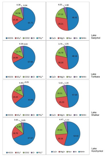The nature of the pH change is closely interrelated with the carbon dioxide equilibrium which is determined by the concentration of bicarbonate ions and carbonates. In an alkaline medium, the content of the bicarbonate ions is 90%, which corresponds to the obtained data of the Sibe lakes system. The content of bicarbonate ions ranged from ~126–127 mg/dm3 (Lake Shalkar and Korzhynkol) to 137.5 mg/dm3 (Lake Sadyrkol). The content of carbonate ions (CO2) varied from 9.0 mg/dm3 (Lake Korzhynkol) to 15.0 mg/dm3 (Lake Sadyrkol). According to the applied classification [,], the waters of the Sadyrkol, Torkara, Shalkar and Korzhynkol lakes belong to the hydrocarbonate-calcium class and the first type in terms of the total ratio of ions. Lake Sadyrkol and Lake Tortkara are characterized by the bicarbonate–calcium-magnesium type (HCO3−–Ca2+–Mg2), Lake Korzhynkol by the bicarbonate–calcium-sodium type (HCO3−–Ca2+–Na+), and Lake Shalkar by the bicarbonate–calcium-magnesium-sodium type (HCO3−–Ca2+–Mg2–Na+) (Figure 4). The salinity of the lakes (84.0 mg/dm3, Lake Tortkara; 93.7 mg/dm3, Lake Shalkar) indicates fresh, slightly mineralized waters. In terms of hardness, the lake waters are very soft (1.15–1.30 mg-eq/dm3).