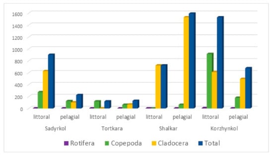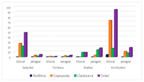 The saprobiological analysis showed the predominance of the β-saprobic species in the composition of zooplankton (most pronounced in Lake Shalkar and Lake Korzhynkol), which indicates a moderate natural pollution of the lakes’ surface waters in corroboration with the Pantle-Bukk saprobity index (1.51–1.83). In sum, the lakes show some differences in the zooplankton, its spatial distribution as well as in total biomass (Table 3 and Table 4; Figure 5 and Figure 6).