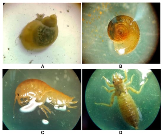 Macrozoobenthos of the Sibe Lakes: (A) Lymnaeaauricularia (Linnaeus, 1758), holarctic species; (B) Anisusdispar (Westerlund, 1871); (C) Gmelinoides sp.; (D) Corduliaaenaeturfosa Forster (larval stage). Optical microscope magnification (A,C) 20×; (B) 30×; (D) 10×.