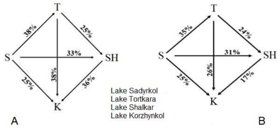 In terms of the lakes’ biocenosis structure, the Jaccard index varies from 17 to 35% (Figure 8). The recorded maximum (moderate-degree) similarity is observed in the macrozoobenthos of the Lakes Tortkara-Sadyrkol and the Lakes Sadyrkol-Shalkar. Other Sibe lakes show a minor biocenosis similarity (with the Jaccard coefficient 17–26%), indicating specific environmental parameters and a high level of autonomous functioning of the individual lacustrine basins. The analytical results point out that the formation and existence of solitary biocenoses in the Sibe lakes occur separately and independently in each lake, in spite of their nearest geographical proximity. This finding provides novel evidence of the closed lakes’ autonomous behaviour in the semi-desert and arid steppe zone of East Kazakhstan.