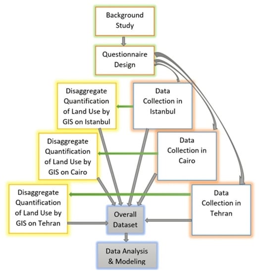 There are two other important variables that are examined in this paper, namely the time passed from the last relocation and daily commuting distance. For the former, the respondents were asked to provide one number in response to the question “how many years ago did your household move to the current home?” In order to quantify the commuting distance, interviewees were asked about the nearest location, landmark, or intersection to their home place and work/study place. It was designed in this way to not violate their privacy. Then, the interviewers marked their living and working places on maps and transferred to ArcGIS by pinpointing on Google Earth first. One-way daily commuting distances were estimated by ArcGIS based on the street networks of the three cities. The commute distances as well as land use variables were all quantified by the study team using ArcGIS in a 600 m catchment area around their homes. This data was connected to the data extracted from the questionnaire for each subject. Thus, a unique dataset was generated for data coming from the survey instrument and the land use quantification. Figure 1 shows how the generation of land use variables by GIS was integrated into the data collection and other methodological sections of the work, such as background studies, questionnaire design, generation of an overall dataset, and statistical analysis.