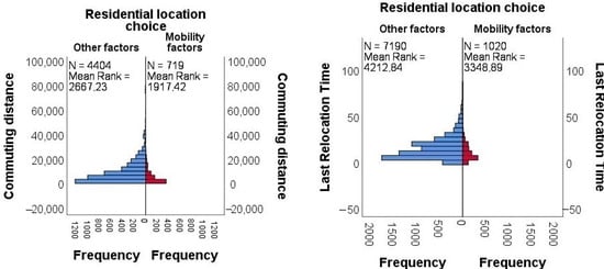 The difference in commuting distance (left) and last relocation time of people (right) who chose their house location based on mobility vs. other reasons.
