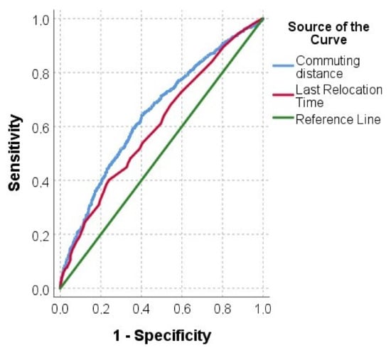 The ROC curve of commuting distance and the last relocation time based on the dummy variable of residential location choice (mobility vs. other factors).