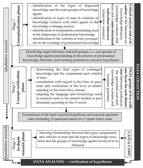 A three-stage data collection research procedure was adopted (Figure 1): conceptualization, verification, and main research. Firstly, the direct semistructured individual interview was applied, with the interview scenario as the research tool. Secondly, focus-group online interviews (FGIO) were led. Five people participated in each focus on the respective dimension of knowledge diffusion (a. between professionals, b. between specialists and other employees, and c. between knowledge workers and external stakeholders). The purpose of the first two stages was to identify types, components, and vehicles of trust seen as the major enabler for dispersing specialists’ knowledge. The starting point was the selection of types of professional knowledge treated as subject to circulation. The obtained results and conclusions drawn were the groundwork for the survey questionnaire. Finally, quantitative research was supported to test the research hypotheses. The computer-assisted telephone interview (CATI) and the computer-assisted web interview (CAWI) were applied. The study questionnaire included 33 questions and was built on a 7-point Likert scale. In spring 2020, 397 research inquiries were addressed to potential respondents. Finally, 105 fully completed surveys were gained. As a consequence, 437 diverse, single variables were obtained referring to the specificity, conditions, determinants, and routines of professional knowledge diffusion in the IT sector in Poland.