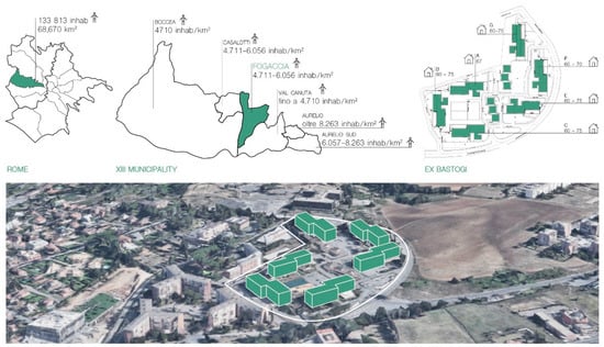 The case study under consideration concerns the regeneration of the Ex Bastogi complex, located in the North-West of Rome, in the 13th municipality (Figure 1). The complex, consisting of six buildings erected in the 1980s as a residence for Alitalia employees, was subsequently assigned by the municipality of Rome to deal with the housing emergency, with the aim of assigning homes to families in need. These housing assignments were offered on a temporary basis (a few months at most), pending final assignment in permanent housing, under the Italian acronym ERP (Public Residential Housing) [18]. Although designed to accommodate 1100 users for short stays, today it has a stable population of 1033 inhabitants, according to the 2011 Istat census, and about 2000 according to qualitative studies (Figure 2) [19]. Overcrowding of the buildings, inadequate accommodation, and the perception of a transience condition extended over the years without any hope of being transferred by the municipality to the ERP, are all factors that contribute to worsening the condition of social hardship of the inhabitants. Although a pronounced social vulnerability can be observed in several urban areas around the world, the Ex Bastogi complex stands out due to the fact that the buildings’ legal definition and status—to this day, about 30 years after its foundation—is devoid of a definitive framework [18]. The singularity of Ex Bastogi lies in the impossibility of ascribing it to any legal status. Indeed, the complex does not fall within the classification of Temporary Housing Assistance Centres (CAAT) or within the occupied buildings or the permanent housing projects (ERPs). Furthermore, Ex Bastogi is an enclave within the urban fabric of Rome that hosts various types of vulnerable groups: children and elderly people in a state of neglect, illegal migrants, people under house arrest, drug addicts, alcoholics, and people with HIV [18].