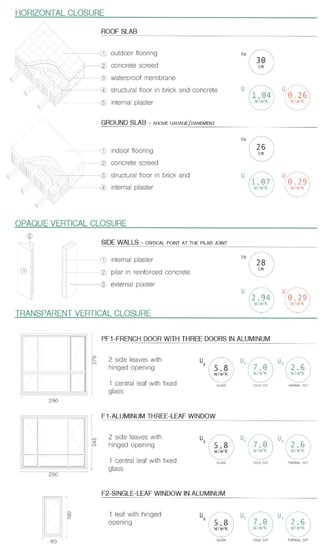 The thermal loss calculation includes losses due to ventilation, transmission, and thermal bridges. The analysis shows how the envelope as a whole does not comply with the current values imposed by the local regulations. The thermal transmittance values, found on the basis of the hypotheses in the current situation, were approximately 1 W/m2K compared to the 0.26 W/m2K required by law for the roof slab and over 1 W/m2K compared to the 0.29 W/m2K required for the ground slab.