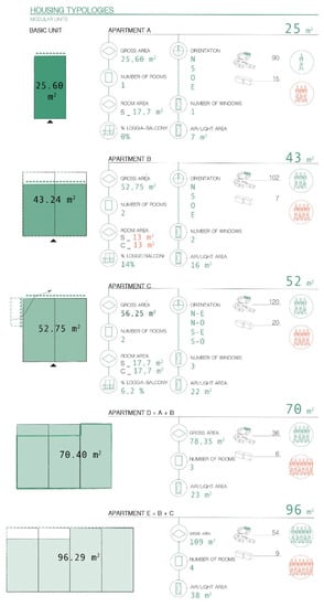 - In order to evaluate the lighting and air flows of the indoor spaces, the analysis examined the 25 square meter single-facing apartments that constitute the basic module and recurs in different orientations.