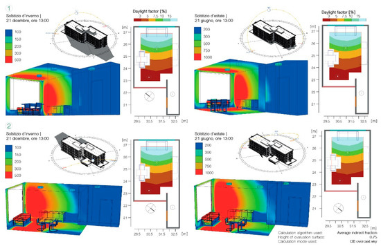 - Relux. The 3D graphics software Relux was used to analyze indoor natural lighting. The first step was the insertion of basic data regarding indoor spaces dimensions, location of the evaluation areas of each room to be calculated: 25 square meter room exposed to SW; 25 square meter room facing NE. Regarding the calculation data, reference was made to the DIN EN 12464-1 values. The simulations, carried out during the summer and winter season, in particular on 21 June and 21 December at 13:00, were set as follows: