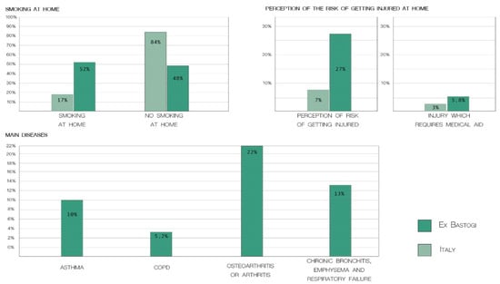 The study revealed that non-smokers, who reported having a diagnosis of asthma, live in poor-quality homes, with humidity and/or drafts problems. The same issues were highlighted by two out of three respondents diagnosed with COPD and non-smokers and by 44.4% of subjects with joint diseases. Furthermore, considering the total number of interviewees, what stands out is that the most recurrent pathologies diagnosed among those indicated in the questionnaire are osteoarthritis or arthritis (22%), chronic bronchitis, emphysema and respiratory failure (13%), and bronchial asthma (10%) (Figure 6).