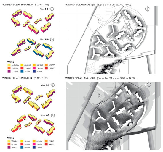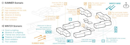 The thermal performance calculation conducted on the case study building shows that the building envelope is not able to protect the indoor environment from outdoor temperatures. According to the sunlight analysis (Figure 8), the roofs are the surfaces most affected by solar radiation at the latitude of the area under consideration. These represent a critical element during both seasons, contributing in summer to indoor overheating and in winter to thermal dispersion. On the other hand, they are configured as the most suitable surfaces for the implementation of photovoltaic systems for electricity production since they are not affected by any shadows cast by the surrounding elements. The external vertical closures exposed to SE/SW (especially those to SW) contribute in summer to the overheating of indoor spaces. Those exposed to NE/NW represent the most critical façades in terms of thermal dispersion during the winter season, as they are not affected by sunlight. Therefore, all the envelope elements will require particular attention during the regeneration design phase in terms of insulation.