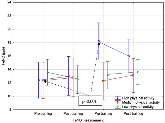 A repeated-measures ANOVA with a Greenhouse–Geisser correction determined that the mean FeNO level differed significantly between time points but only for students who kept high physical activity (F(6, 141) = 3.01, p < 0.01, ηp2 = 0.11). Post hoc tests using the Bonferroni correction revealed that students with high physical activity before the second training had significantly higher FeNO values in comparison to the first pre-training measurements and first post-training measurement (18.1 ± 5.4 ppb vs. 13.0 ± 6.1 ppb vs. 12.4 ± 5.3 ppb, respectively, p = 0.01 and p = 0.002, respectively). There were no significant between-group differences (Figure 1). Moreover, the results did not change after controlling for BMI, age, and sex. After conducting two-way repeated measures ANOVA, the results showed no significant differences. F(3, 44) = 1.53, p = 0.2 between measurements, F(6, 88) = 1.04, p = 0.4 for interaction between FeNO levels and weekly level of physical activity, and there was no interaction between FeNO levels and groups of students who were professional sportspersons vs. non sportspersons (F(3, 44) = 0.65, p = 0.5.