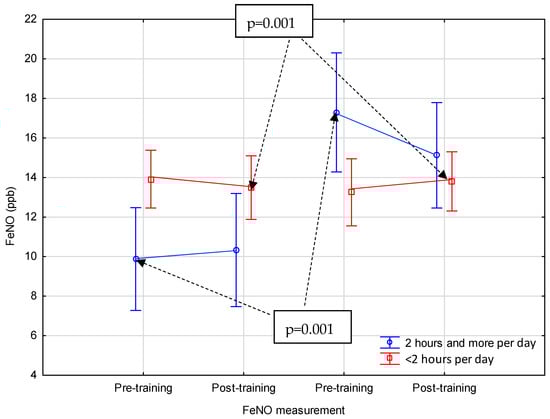 FeNO values during the first and second session of training according to daily time during physical activity (≥2 h per day vs. <2 h per day).