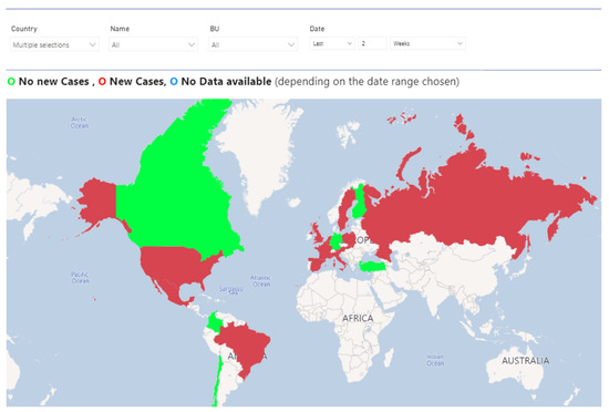 The CoDa provides clear, simple summary visual information on a map, where countries with new confirmed cases in the given period are indicated in red (Figure 3), and a table shows where the new confirmed cases developed in the last 7, 14 and 21 days at each site. Moreover, the CoDa includes daily tracking of confirmed and suspected cases. An anonymous list is made both of confirmed cases, reporting the dates of sick leave and diagnosis, and the reason for testing (onset of symptoms, close contact inside or outside the plant), and of suspected cases, reporting the date of sick leave, the reason for suspicion (onset of symptoms, close contact inside or outside the plant), and whether the RT-PCR test was performed.