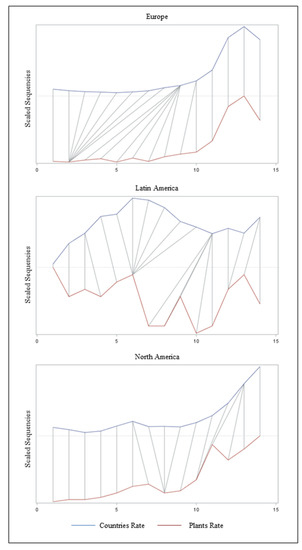 A significant cross correlation between the incidence rates inside and outside the sites was observed both in the EU and NA, with higher coefficients at lag 0 than at lag 1, while no significant correlation was observed in LATAM (Table 2). Analysis of the normalized time series (Figure 4) showed a similarity of the slope of the incidence rates, that was higher in the EU and NA than in LATAM, as confirmed by a smaller AD and DTW in EU and NA (Table 2). These results indicate that the trends of infections in the plants punctually followed the temporal trend of the epidemic in the general population in EU and NA, but not in LATAM.