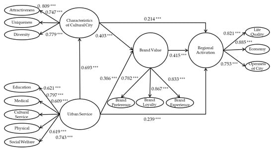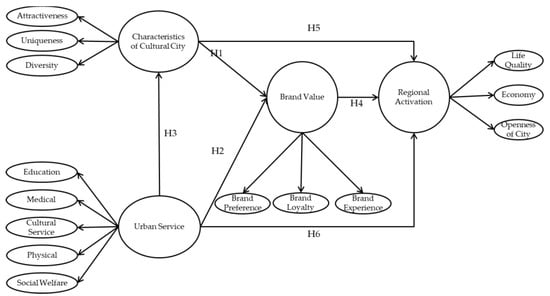 Urban service can affect the city’s brand value. Urban services were defined as education, medical care, cultural services, physical education, and social welfare [,]. Urban services can increase citizens’ satisfaction and services for the city as the brand loyalty for a product or service. This can increase the brand value of the city that citizens have. Urban services not only include the basic services that maintain the survival of residents but also various systems according to the characteristics of the area, such as city planning, public infrastructure, and public transportation systems. Therefore, a city with stable and convenient service functions will have positive influences on its development as a cultural city. Thus, we hypothesized that: