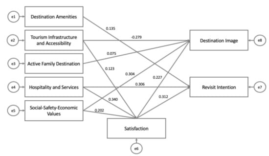 The connection of satisfaction and destination image has been widely recognized, further leading toward two research areas—destination image as an antecedent of tourism satisfaction [55,65] and found satisfaction as an antecedent of the destination image. Chen and Tsai [55] argued that tourists use the perceived image of the destination to form expectations and compare them with post-travel experiences. Consequently, a positive destination image will increase the propensity to make a positive evaluation of the sojourn and enhance intentions to return and recommend the destination [11].