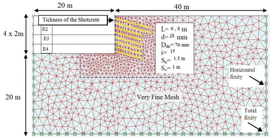 As for the input, the PlAXIS.V8.3 geometry software, which involved the nails and shotcrete procedures, was to be modeled. In what followed, the boundary conditions and the geometry of the construction process were defined, and material parameters were inserted. After completing these processes, appropriate finite element meshes were selected and prepared to be meshed based on this. As shown in Figure 1, the selected mesh size was made finer by as much as one degree to raise the accuracy of the calculations around the nails. With the completion of the generating model, , the procedure was used for generating sustainable strains. It must be noted that the value of was considered much the same as based on Jackie’s equation.