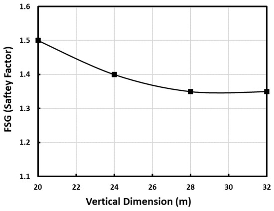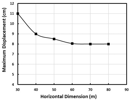 One of the methods to test whether the model boundaries are located a sufficient distance from the area of interest is to change the fixities (e.g., add and remove vertical fixity at the vertical boundaries) to see if this affects the key outputs. If no significant effect is observed, then the boundaries are located sufficiently far away [20]. A sensitive analysis has been done on the model under different fixities and boundary conditions. The stress state outputs were checked; stress changes were less than 5% at the model boundaries and displacements, and no significant effect on the results was achieved by increasing the dimensions [20]. The results of the sensitivity analysis in the horizontal direction are shown in Figure 2. From Figure 2, there are no significant changes in maximum displacement that can be observed after 60 m in the horizontal direction. Figure 3 shows the variation in the vertical dimension versus safety factor. It can be seen that by increasing the vertical dimension after 28 m, there is no significance in the safety factor of the wall and also no significant changes in displacement and stresses.