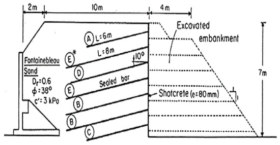 The finite element model was validated by comparison with a back-predicted result from a full-scale test carried out in 1986 for the French national research project CLOUTERRE [21]. The CLOUTERRE project’s soil nailed wall is 7 m high and 7.5 m wide. Figure 4 depicts a cross-section of the soil nailed wall.