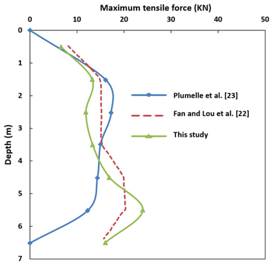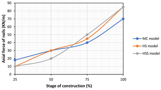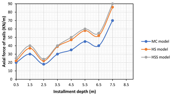 Figure 11 and Figure 12 show the maximum axial force generated at the unit of nail length at different stages of excavation and under different depths of installment, respectively. Axial forces in the nail at the HSS model are a bit higher than the HS and MC models.