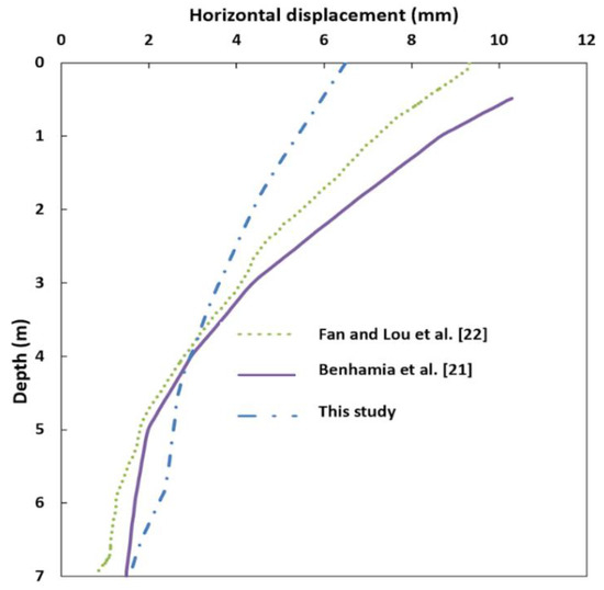 Figure 10 shows the effects of the modeling approach on the maximum lateral displacement of the wall during the construction stage. From Figure 10, it can be clearly obtained that the MC model estimated a lateral displacement higher than HS and HSS. This is related to the linear behavior of the MC model prior to the yielding state. Therefore, it can be shown that the application of HS and HSS models provides more reasonable results than the MC model. The maximum lateral displacements of the three models were shown at each phase of modeling in Figure 10.