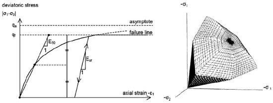 The main idea for formalizing this model is the hyperbolic relationship between axial strain and diversionary strain in relation to triaxial loading. The main parameters of the model include strength parameters φ and Ψ, C as such stiffness parameters and which can control the behavior of the soil deformation as it is presented in Table 2, and the unloading-reloading reference modulus, . The extent to which stiffness is dependent on strain level is determined by the factor m. m value is laid in the range of zero to one. The relationship between the strain and the deviatoric stress is shown in Figure 8.