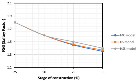 The results of the global safety factor are presented at each stage of construction by using the three behavioral models in Figure 9. From Figure 9, every three models show similar results for global safety factors at different stages, and there is no significant difference between the values obtained from HS and HSS behavioral models and those of MC.