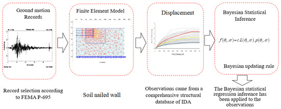 A Bayesian regression-based demand model with a linear regression formulation in the logarithmic space is developed to predict the maximum displacement for the soil nail wall and the efficiency of the Intensity Measures (IMs). PGA and Sa(T1,5%) are chosen as an intensity measure (IM), and displacement of the wall is chosen as an engineering demand parameter (EDP). The different performance levels of the bridge are considered through slight, moderate, and extensive levels. Bayesian regression analysis has been utilized to develop a probabilistic demand model to predict damage in the soil nail wall. One of the advantages of the Bayesian regression is that uncertainty related to incomplete sample populations is directly considered by standard deviation σ and regression coefficients, which are random variables, rather than constant variables. In another step to propose a suitable intensity measure, the sufficiency of the intensity measures is also examined for the efficient intensity measure. In the end, fragility curves are presented to define the failure probability of the soil nail wall structure.