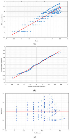Graphical diagnoses of the regression model, Sa(T1,5%); (a) model prediction; (b) Quantile-Quantile graph; (c) residual graph.