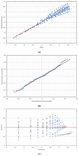 Graphical diagnoses of the regression model PGA; (a) model prediction; (b) Quantile-Quantile graph; (c) residual graph.