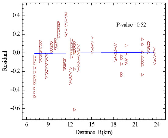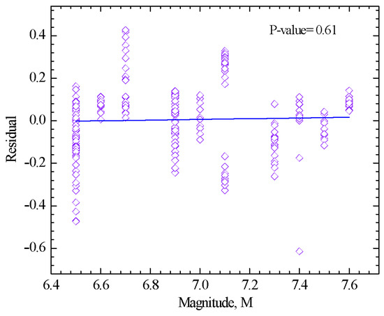 Sufficiency is a criterion that shows the IM is statistically independent of earthquake ground motions such as Magnitude (M) and Epicentral distance (R). Regression analysis is needed on the residuals. Lower p-values show that the regression estimate’s coefficient is statistically important. A p-value of 0.10 was the cutoff for an insufficient IM [13]. The p-values are 0.52 and 0.61 based on R and M, which shows that the Sa(T1,5%) is a sufficient IM for conditioning the probabilistic seismic demand analysis (PSDA) (see Figure 20 and Figure 21).