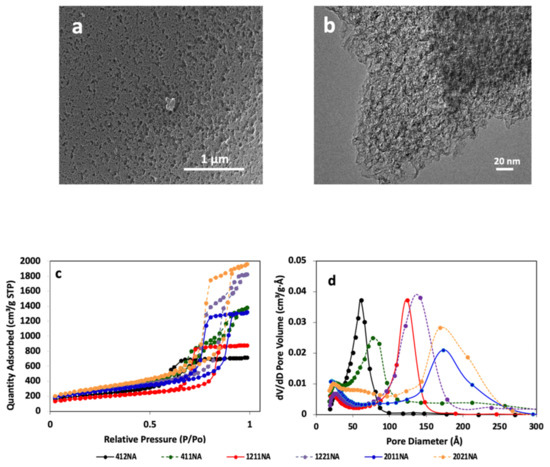 A series of hierarchical porous carbons with abundant mesopores and macropores were fabricated via the ice-templation approach. SEM and TEM images in Figure 1a,b depict an open foam-like structure with mesoporosity replicating the etched silica template. The nitrogen isotherms as in Figure 1c exhibit IV type characteristics, indicating that the HPCs possess mainly mesopores. Table 2 presents the textural characteristics of HPCs. Clearly, HPCs exhibit a broad range of BET-specific surface area up to 1100 m2/g, pore volume up to 3 cm3/g, and controlled dominant average mesopore size.