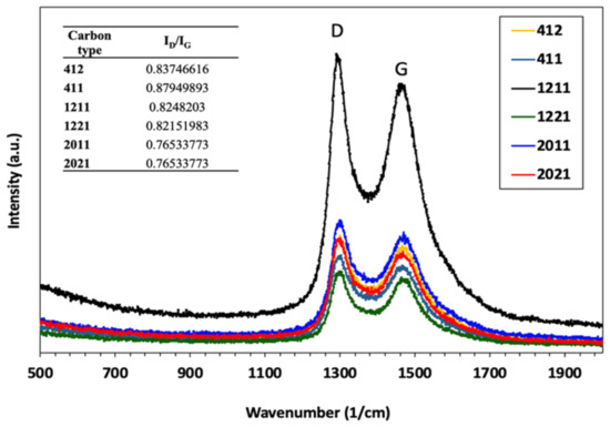 Raman spectra can be used to reveal information about the degree of graphitization. All HPCs show two main peaks corresponding to D and G bands, as in Figure 2. The D band, which is centered at around 1350 cm−1, is related to the occurrence of structural deformity in the carbon structure, and the G band (which is centered at around 1590 cm−1) is related to sp2 atoms stretching.