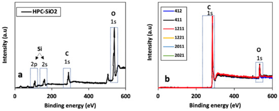 XPS survey scans for (a) HPC-SiO2 prior to silica etching and (b) all HPCs.