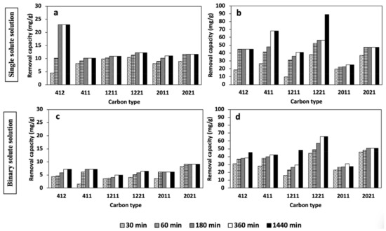 Interestingly, Figure 6 demonstrates that in both types of solutions (single and binary), increasing the pore volume for the studied mesopore size does not result in a significant effect in the removal of Cd2+ compared with when Pb2+ is used as a targeted heavy metal. Notably, HPC412 with around 50% less pore volume possesses a higher Cd2+ removal capability compared with HPC411.