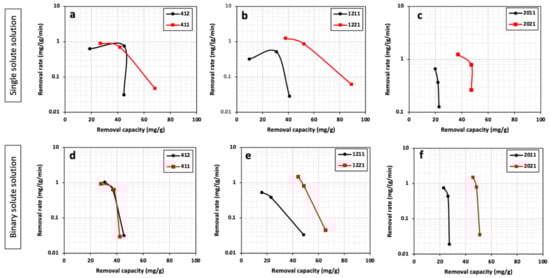 Removal rate vs. removal capacity of Pb2+ in single (a–c) and binary (d–f) solute systems for all HPCs.