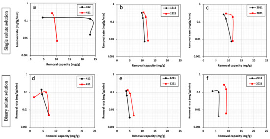 Removal rate vs. removal capacity of Cd2+ in single (a–c) and binary (d–f) solute systems for all HPCs.